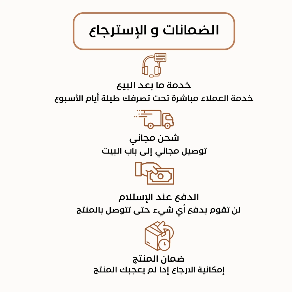 جميع المنتجات المعروضة في متجرنا تخضع لسياسة الاستبدال واسترداد الأموال وفقًا للشروط والأحكام المبينة على هذه الصفحة.